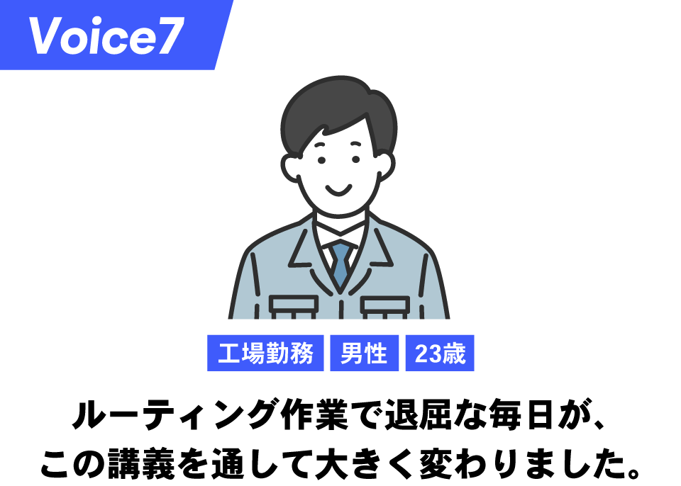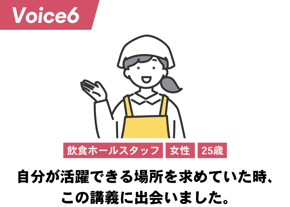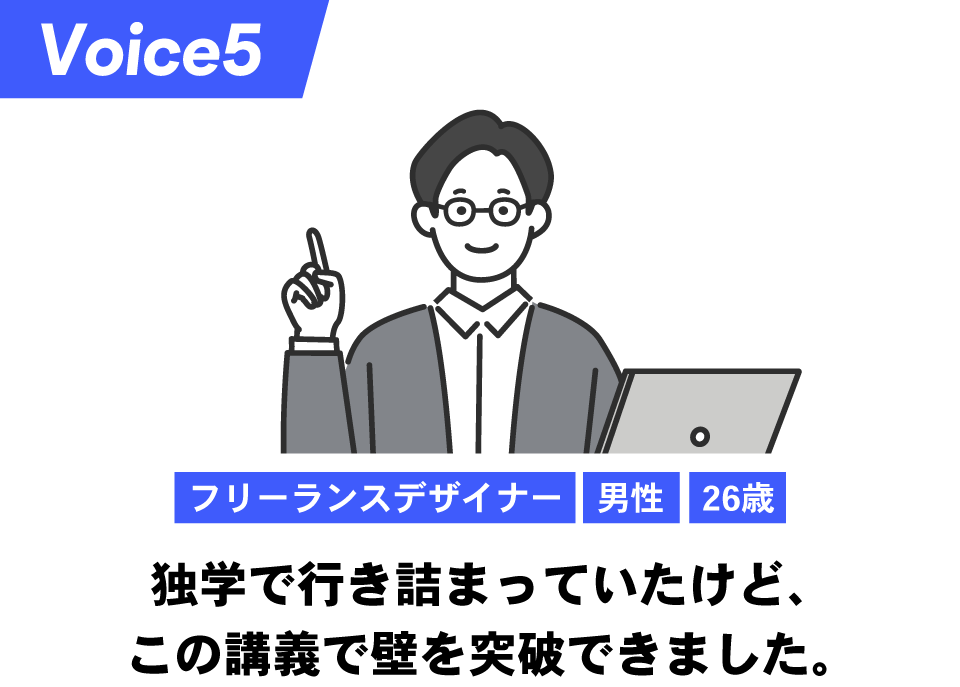 - 趣味程度ではデザインをしていてずっとデザインという仕事に興味があったものの、仕事が忙しくてなかなか一歩を踏み出せずにいました。ただこの講義に参加して勇気をもらい背中を押してもらいようやくデザインの世界に本格的に足を踏み入れることができました。